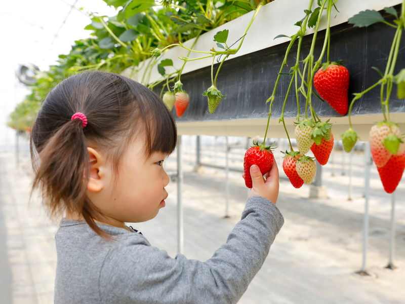 いちごの栽培には京都ファームと同じく「高設栽培」を採用。小さなお子様の目線の高さに合わせて設計されており、視界いっぱいに広がるいちごを自分の手で収穫する体験は情操教育にもぴったりです。